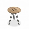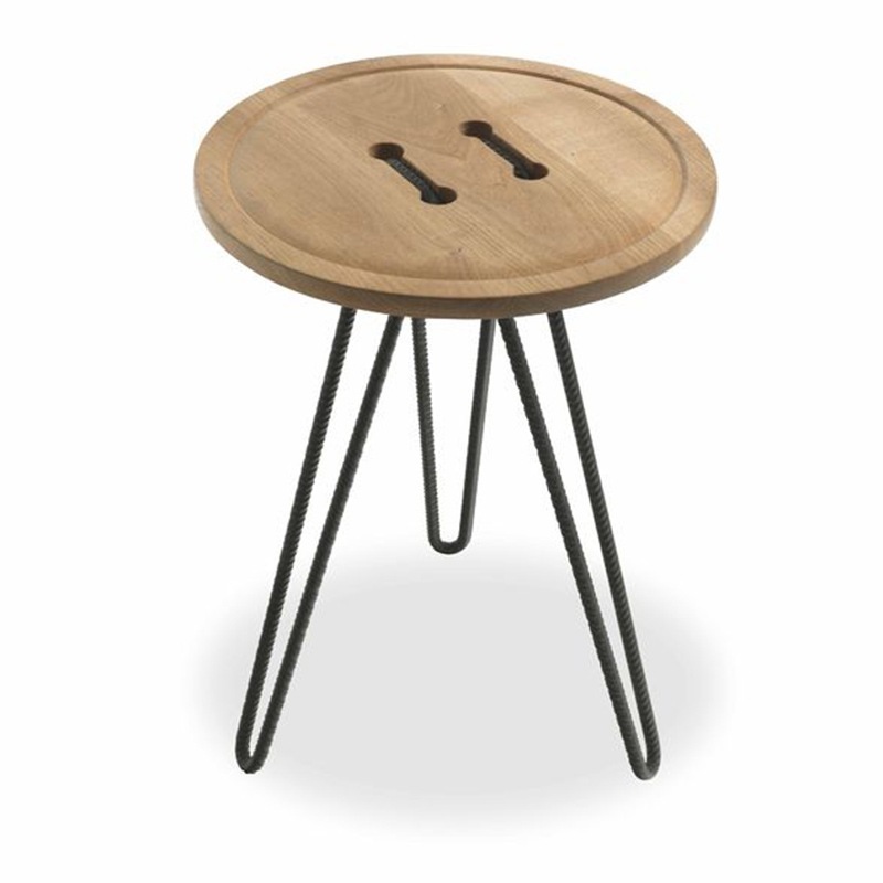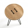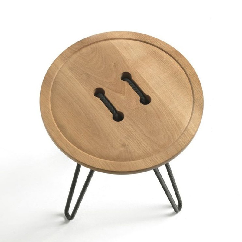 Große Knöpfe aus Massivholz mit großem Faden eingefädelt - die Bearbeitung des Button Couchtischs erinnert an einen großen Knopf - das Metall aus Armierungseisen an Nähgarn.