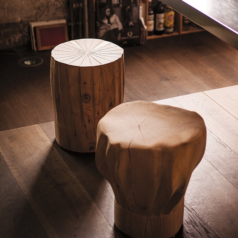 Hocker in Form einer maßstabgetreuen Kochmützen-Nachbildung, gefertigt aus einem massiven Block duftenden Zedernholzes.