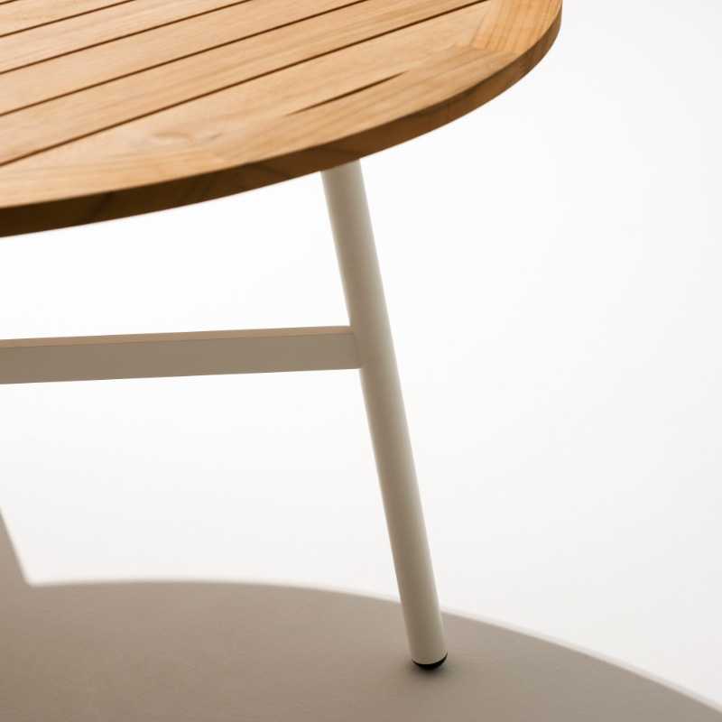 Tisch mit runder Tischplatte, wahlweise aus grauem Steingut oder Teakholz mit Lamellen.